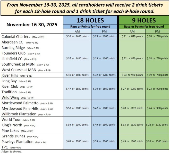 Prime Times Cardholders will redeem free rounds under our “5th round free” model at all 21 Founders Collection Courses. The 5th round free redemption value will be based off the rate at that time. See chart above for rates and points needed for rounds through December 2025.