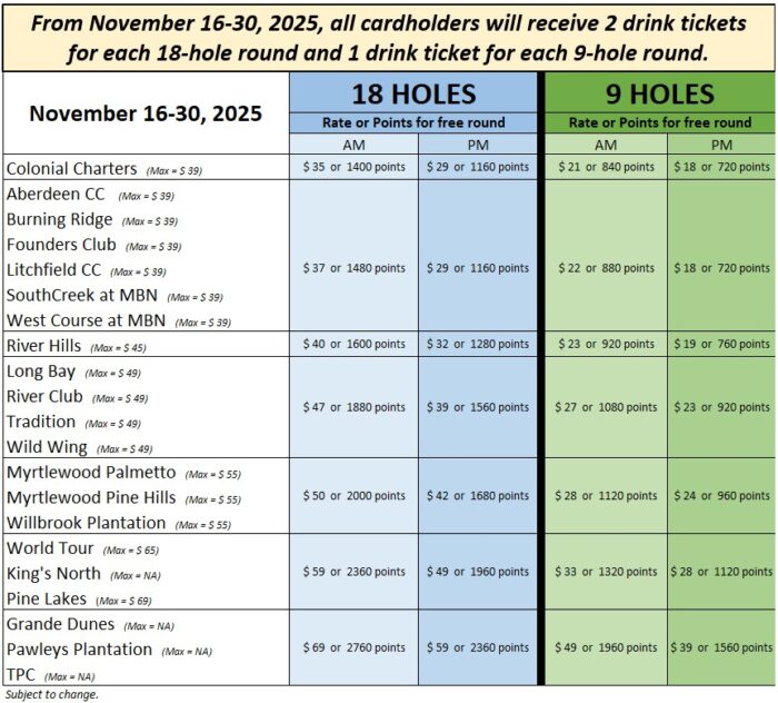 Once you become a Signature Cardholder, you will receive points for each round of golf you play. Once you accumulate enough points, you can redeem your FREE round during check in at the golf course. Prime Times Signature Cardholders will redeem free rounds under our “5th round free” model at all 21 Founders Collection Courses. The 5th round free redemption value will be based off the rate at that time. See chart below rates and points needed for Free rounds at each course through November 30, 2025. This information will be updated each time there is a rate change.