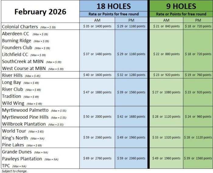 Once you become a Signature Cardholder, you will receive points for each round of golf you play. Once you accumulate enough points, you can redeem your FREE round during check in at the golf course. Prime Times Signature Cardholders will redeem free rounds under our “5th round free” model at all 21 Founders Collection Courses. The 5th round free redemption value will be based off the rate at that time. See chart below rates and points needed for Free rounds at each course through February 2026. This information will be updated each time there is a rate change.